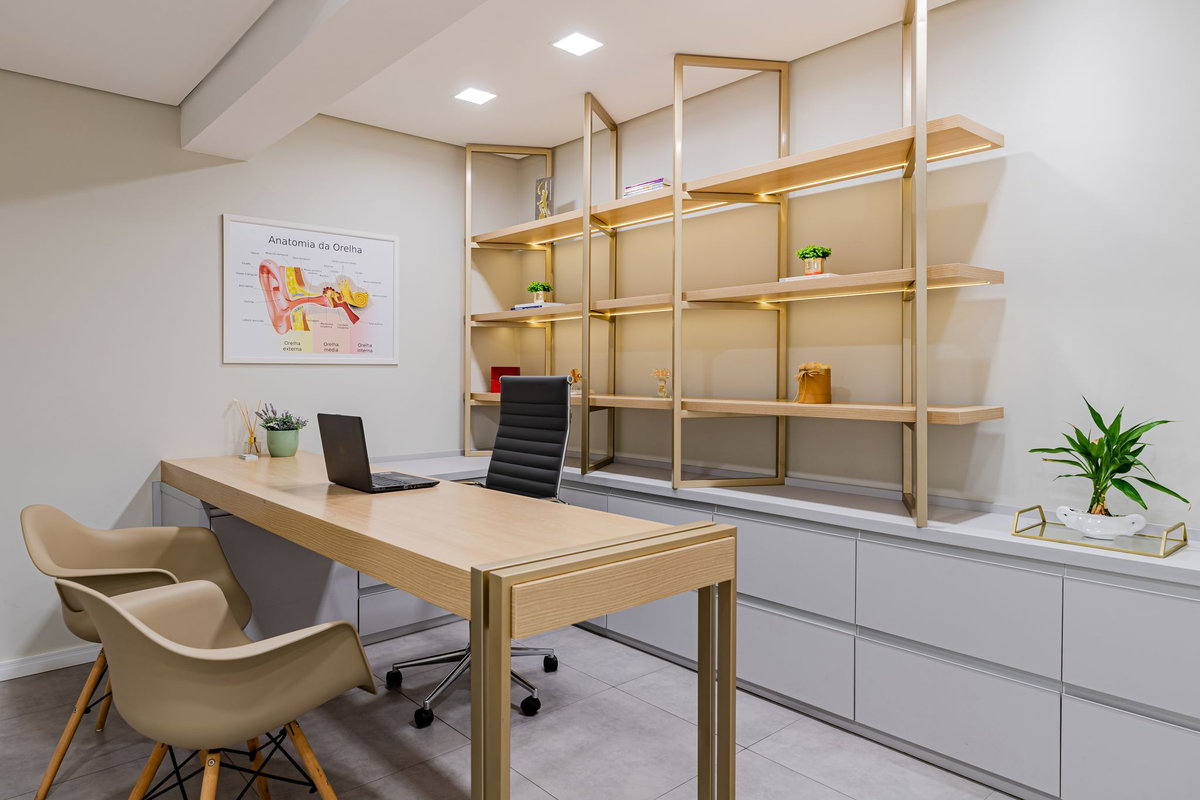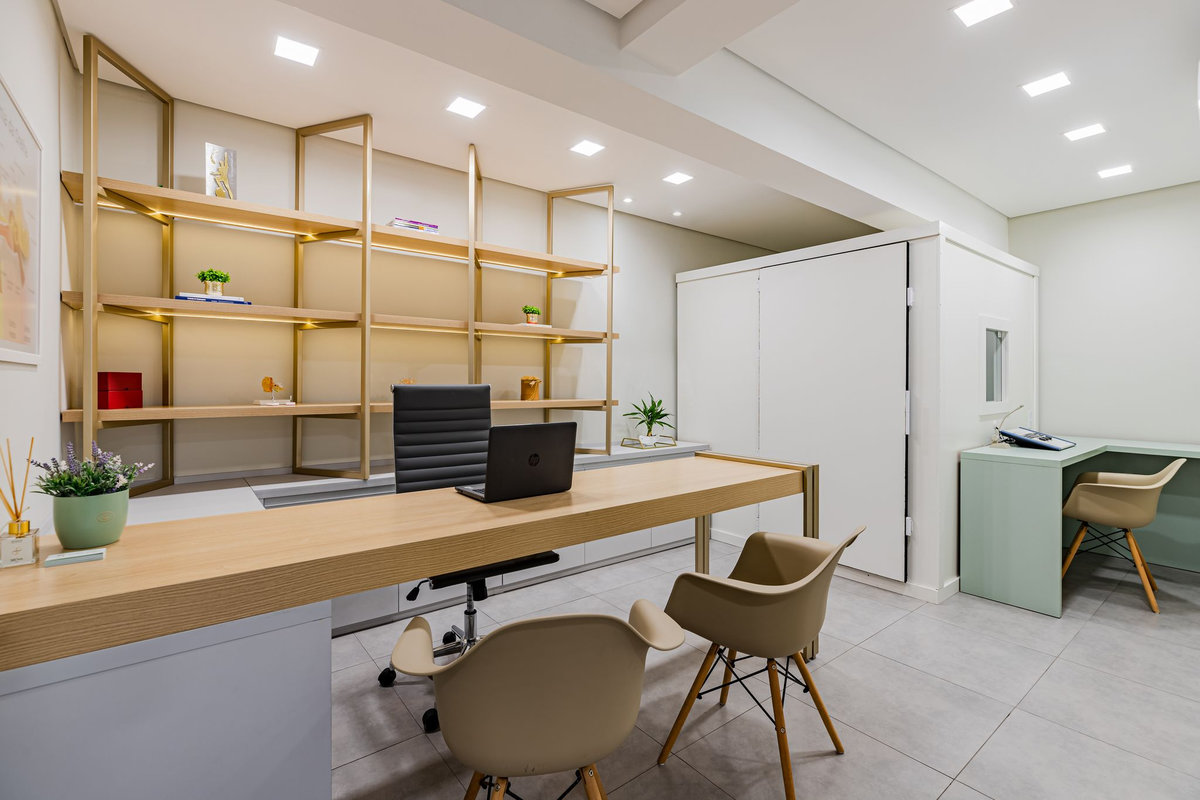 O projeto de interiores desta clínica de fonoaudiologia buscou unir modernidade, sofisticação e acolhimento, criando um ambiente leve e tranquilo para os pacientes. A luz natural foi amplamente valorizada, assim como as paredes verdes e o MDF amadeirado, que trazem frescor e aconchego. A mobília clara e os detalhes em dourado completam o espaço com elegância e harmonia. O resultado é uma clínica funcional, humanizada e esteticamente agradável, pensada para o bem-estar de todos.