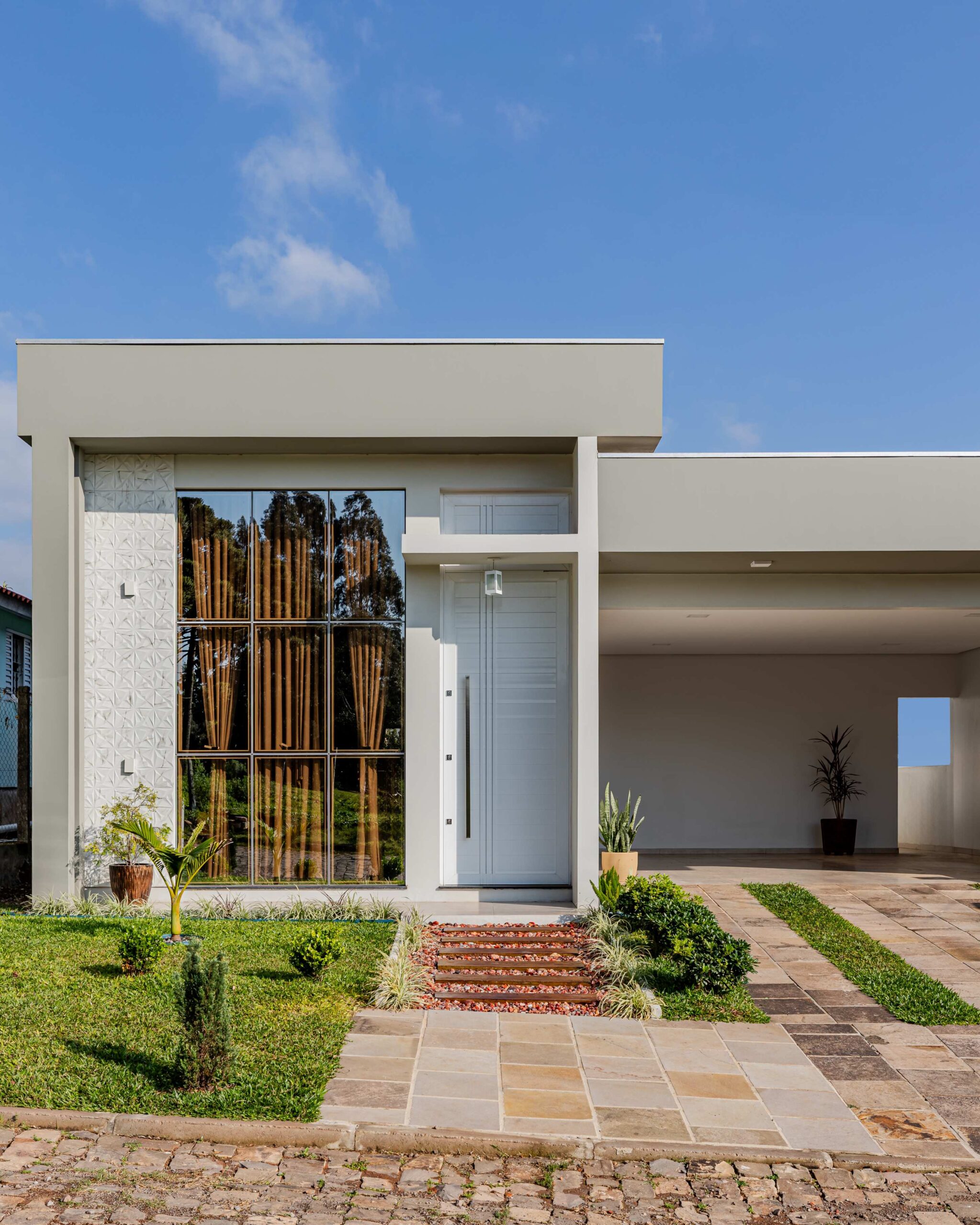 O jardim na frente da residência, com um mix de plantas, cria uma atmosfera descontraída. A garagem aberta e integrada com o externo, traz a sensação de leveza da residência. O revestimento na fachada, neutro e leve, auxilia nos detalhes que colaboram com a arquitetura da casa.